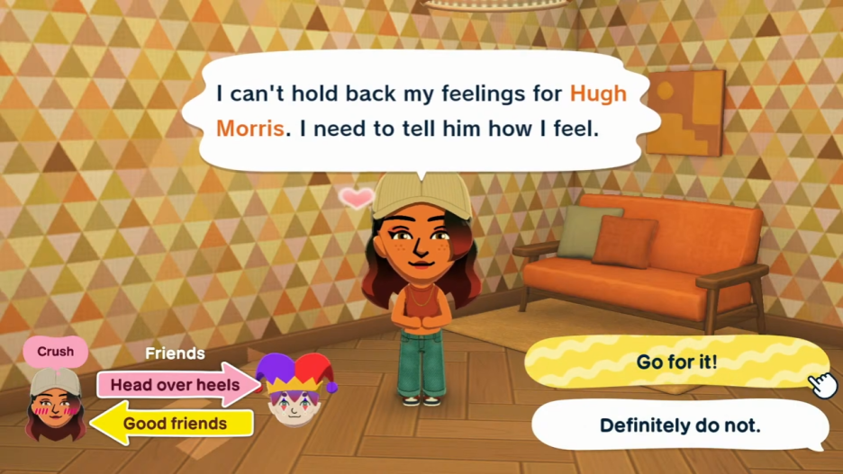 이때 사랑에 빠진 Mii의 인간관계 화살표엔 '많이 좋아함'이라고 뜬다.