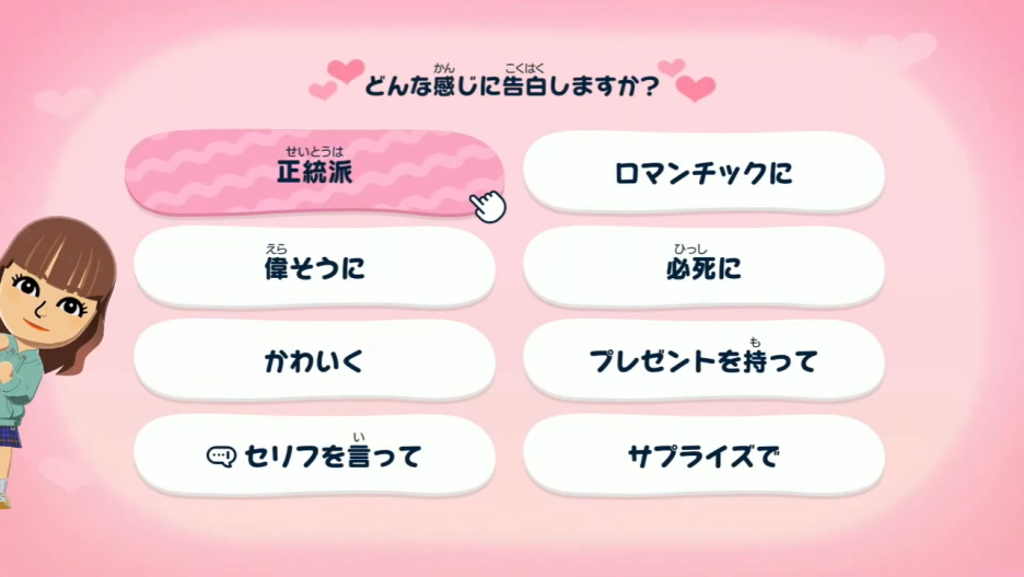 대신에 이번작에선 고백 장소로 'Mii의 집 안'과 '대관람차 안', 그리고 '장소 직접 지정'이 새로 추가됐다!