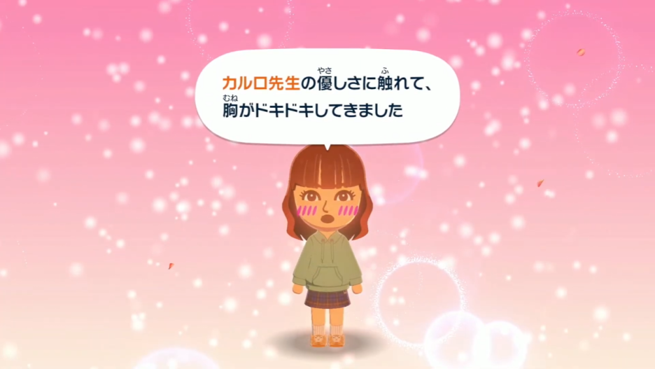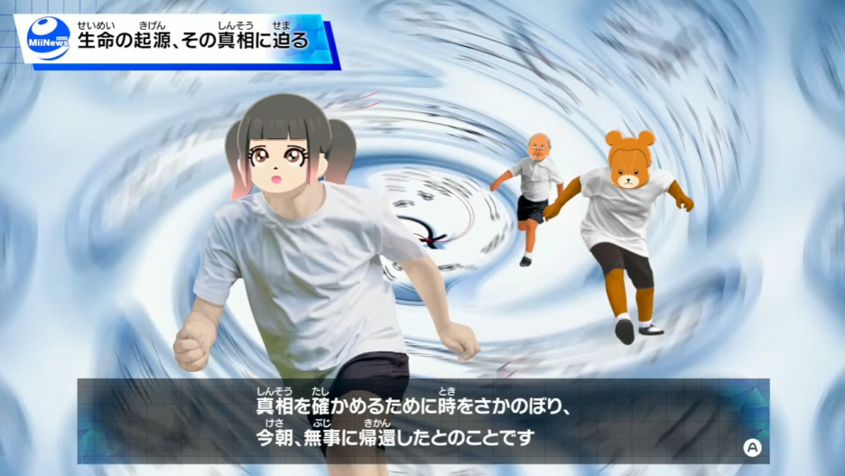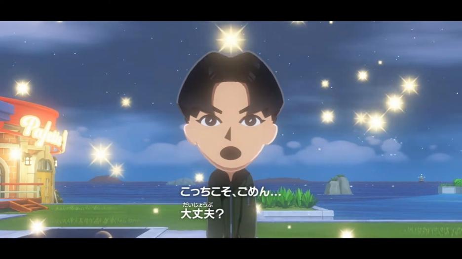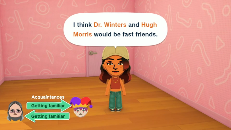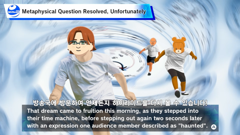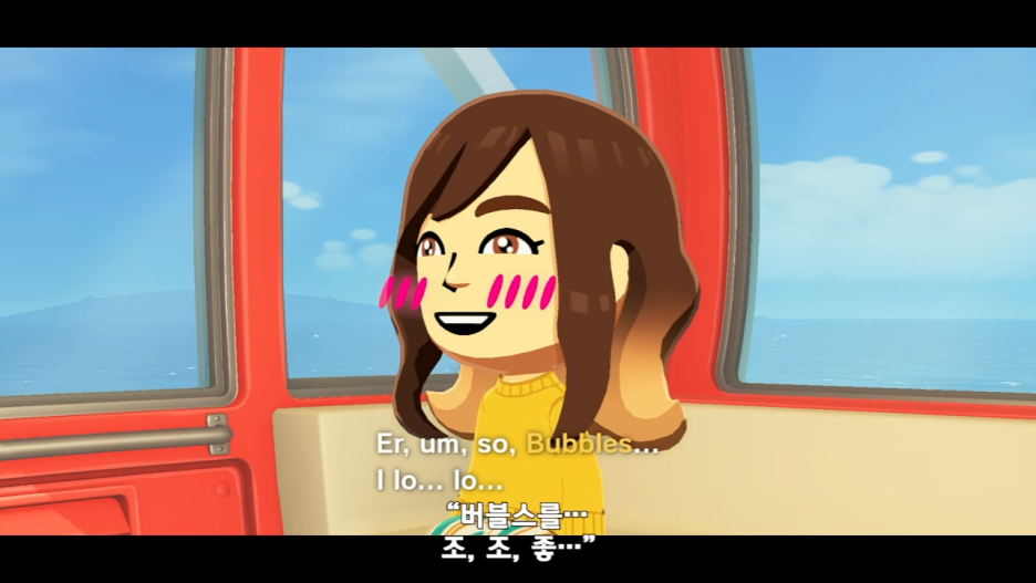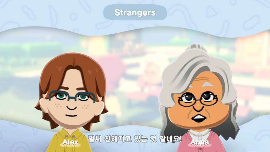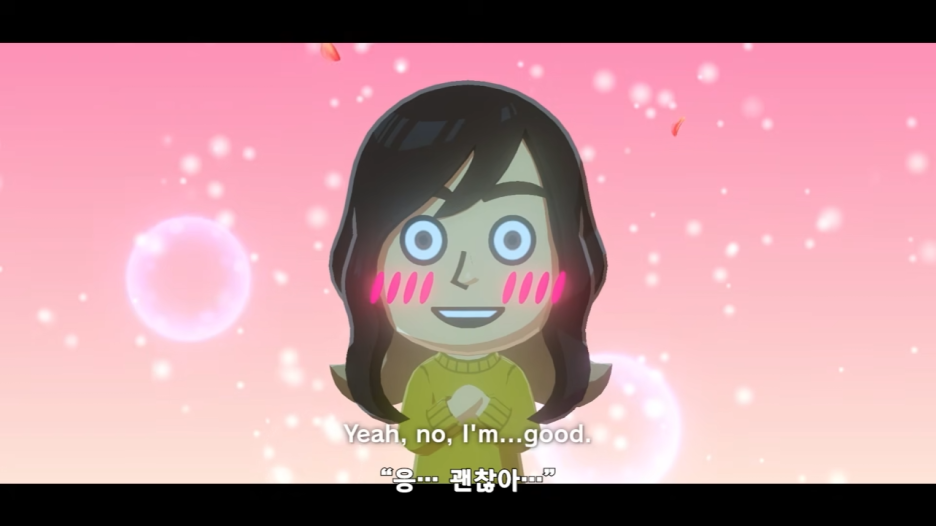 그리고 이때 일본판과 북미판 트레일러 스크린샷에서 'Mii의 지인이 걱정하고 있다'라고 언급하고, 일본판에선 처음에 카를로할배랑 아주머니 지인으로 이어줄 때 지정했던 대화주제도 언급한 걸 보면 Mii들에게 기억력 시스템 탑재 + 인간관계에 따라 위로 멘트도 달라지는 듯하다.