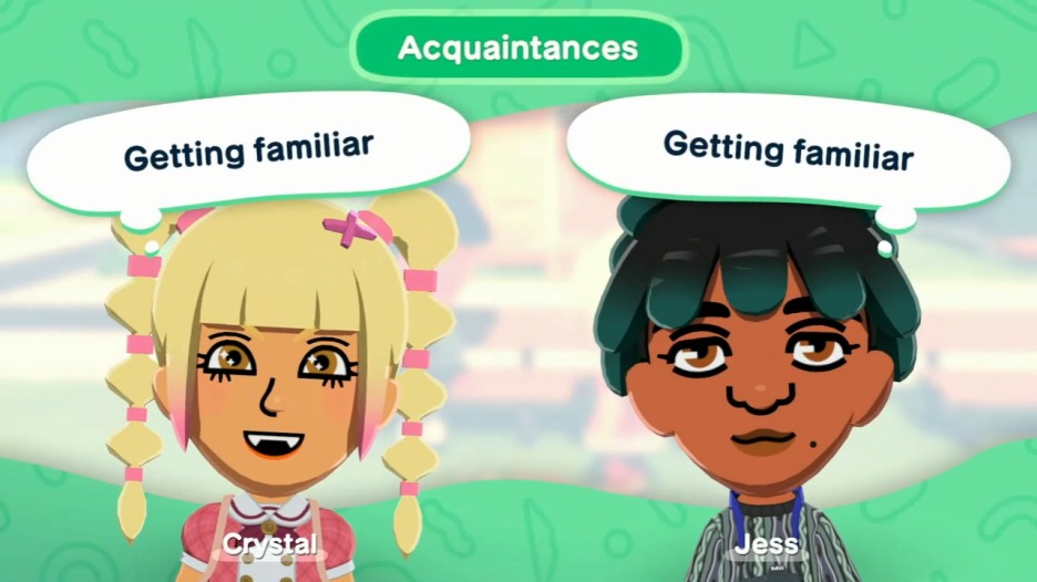 위 스크린샷에서 Mii들의 관계 화살표가 '아는 사람' 단계는 녹색, '친구' 단계는 노란색, 사랑에 빠진 상태에선 분홍색으로 나오는 듯하다.