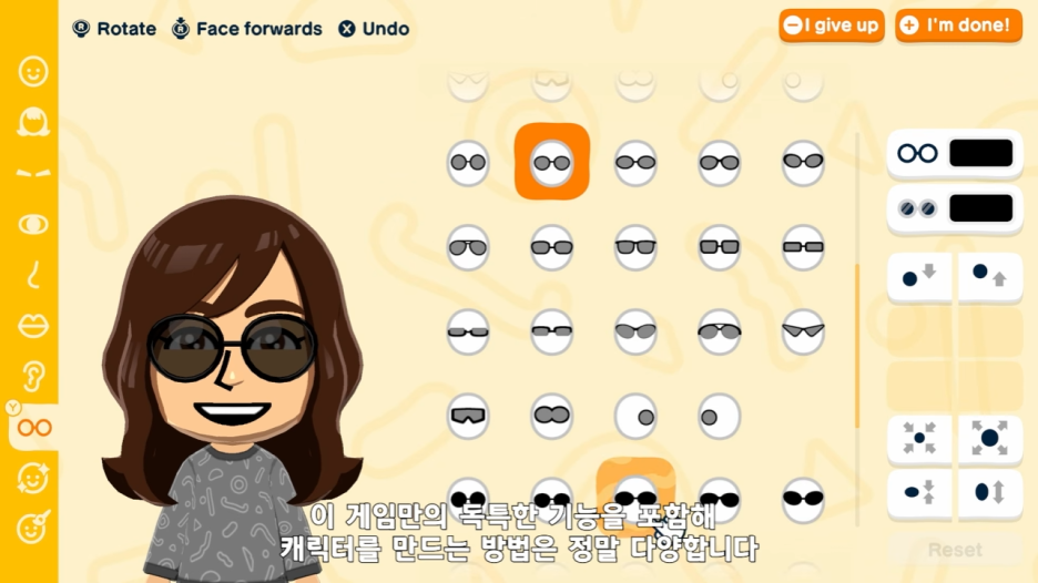 전작과는 달리 안경 테와 렌즈 색깔은 개별적으로 설정 가능하고, 전체 크기나 세로 길이도 수정 가능해보인다.