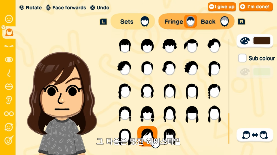 뒷머리를 커마할 때는 Mii를 측면으로 돌려서도 커마하는 게 가능해 보이는데, 뒷머리 파츠는 최소 125가지가 있는 것 같다.